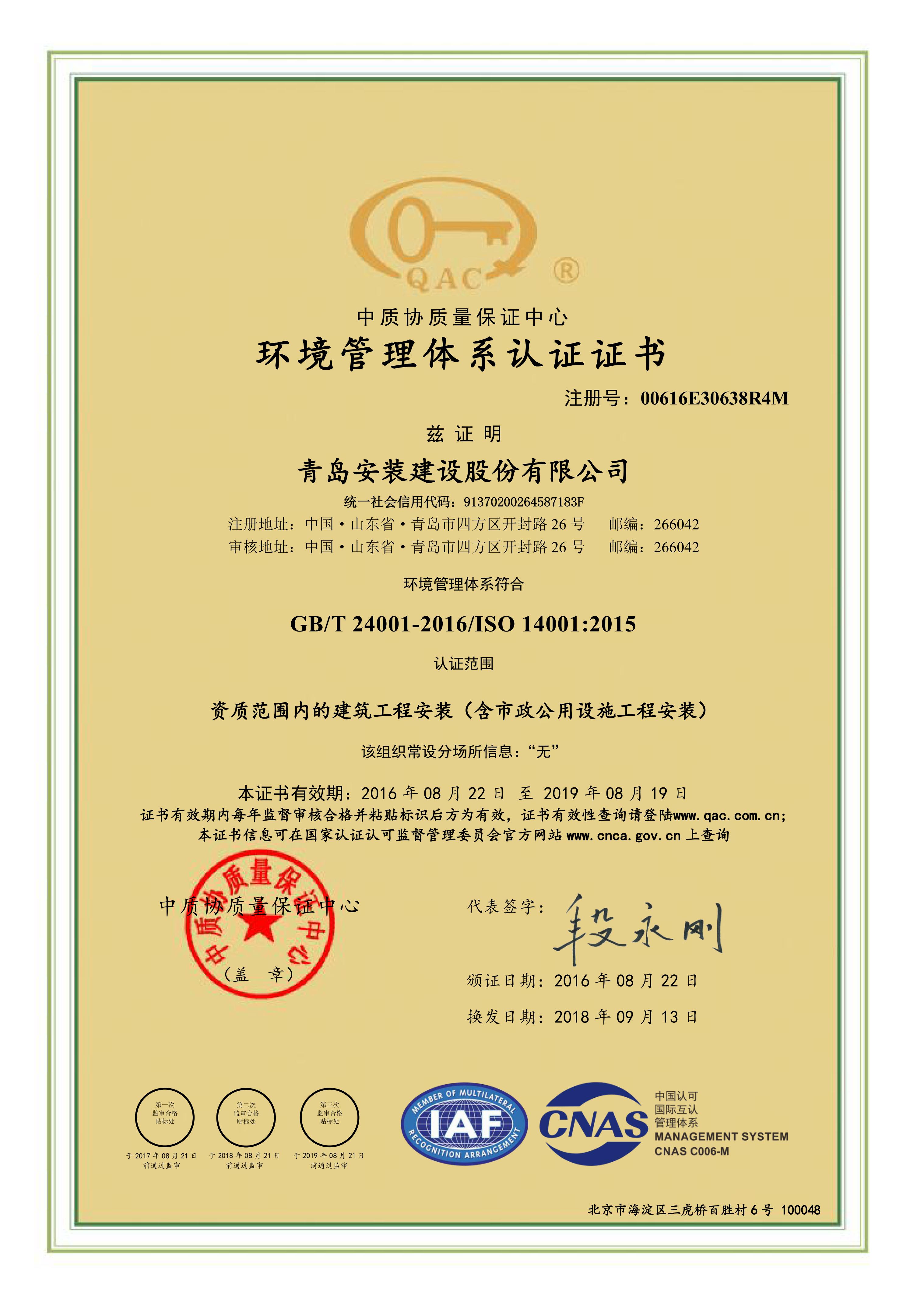 環(huán)境管理體系認(rèn)證證書