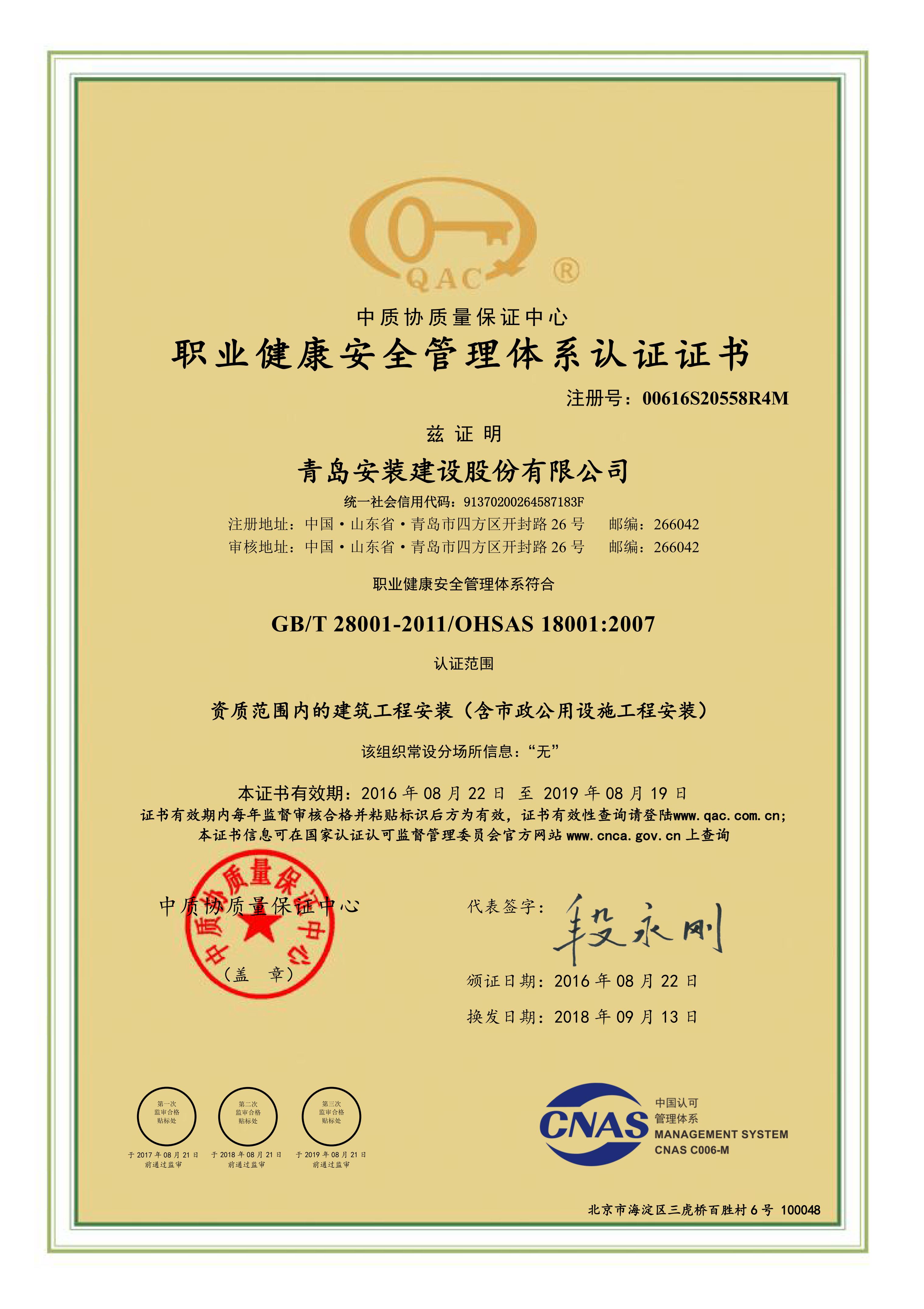 職業(yè)健康安全管理體系認(rèn)證證書