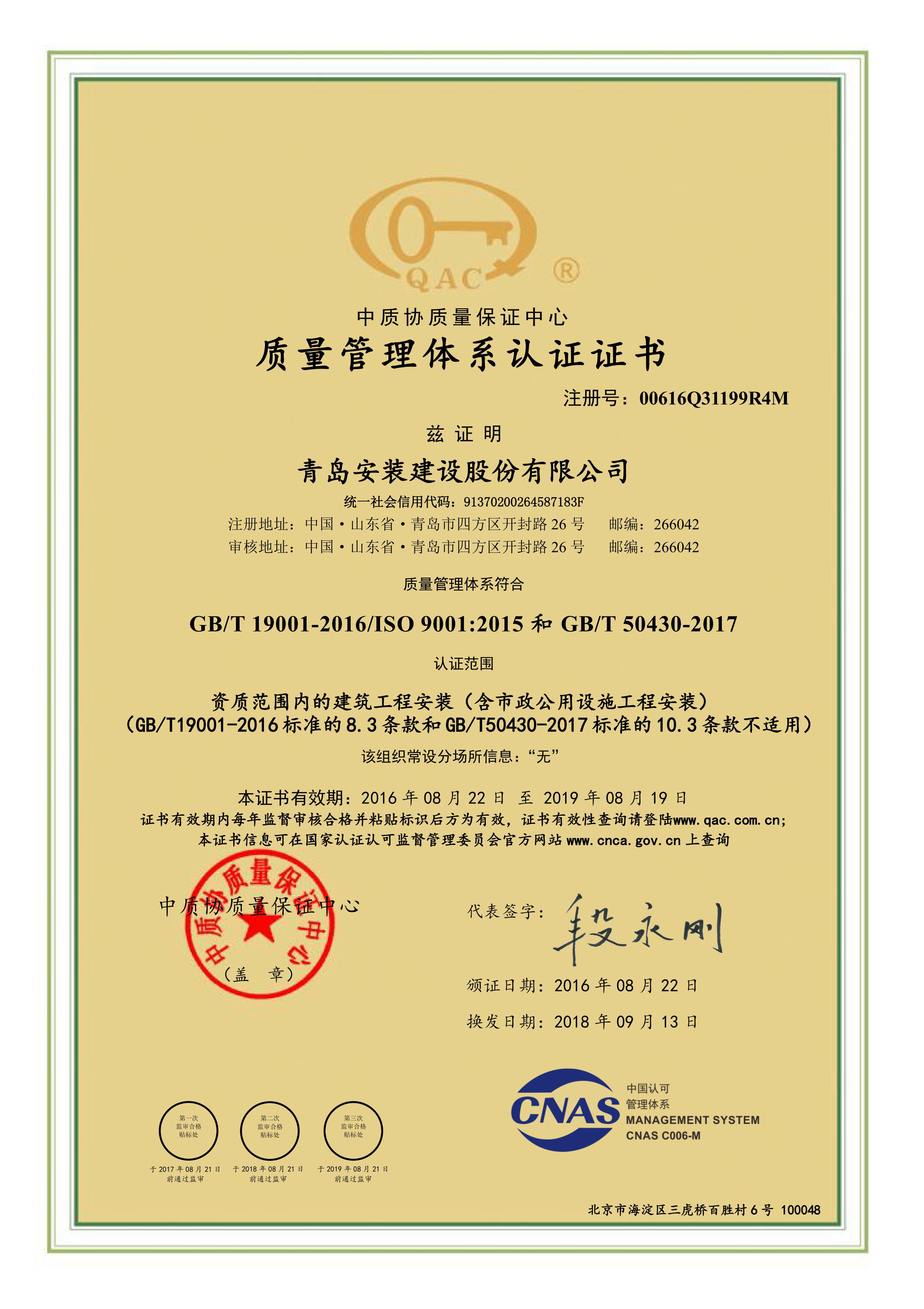 質(zhì)量管理體系認(rèn)證證書